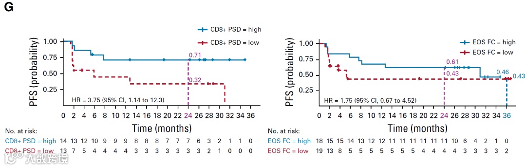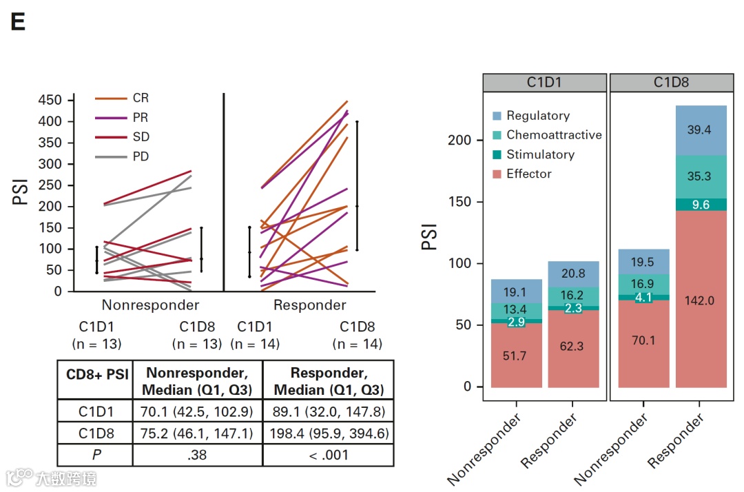与Non-responder组的患者相比,联合用药一周后( C1D8),治疗缓解组(CR+PR)患者的CD8+ T细胞的PSI升高约2.2倍,且该结论与持续追踪36个月后的疗效结果一致。