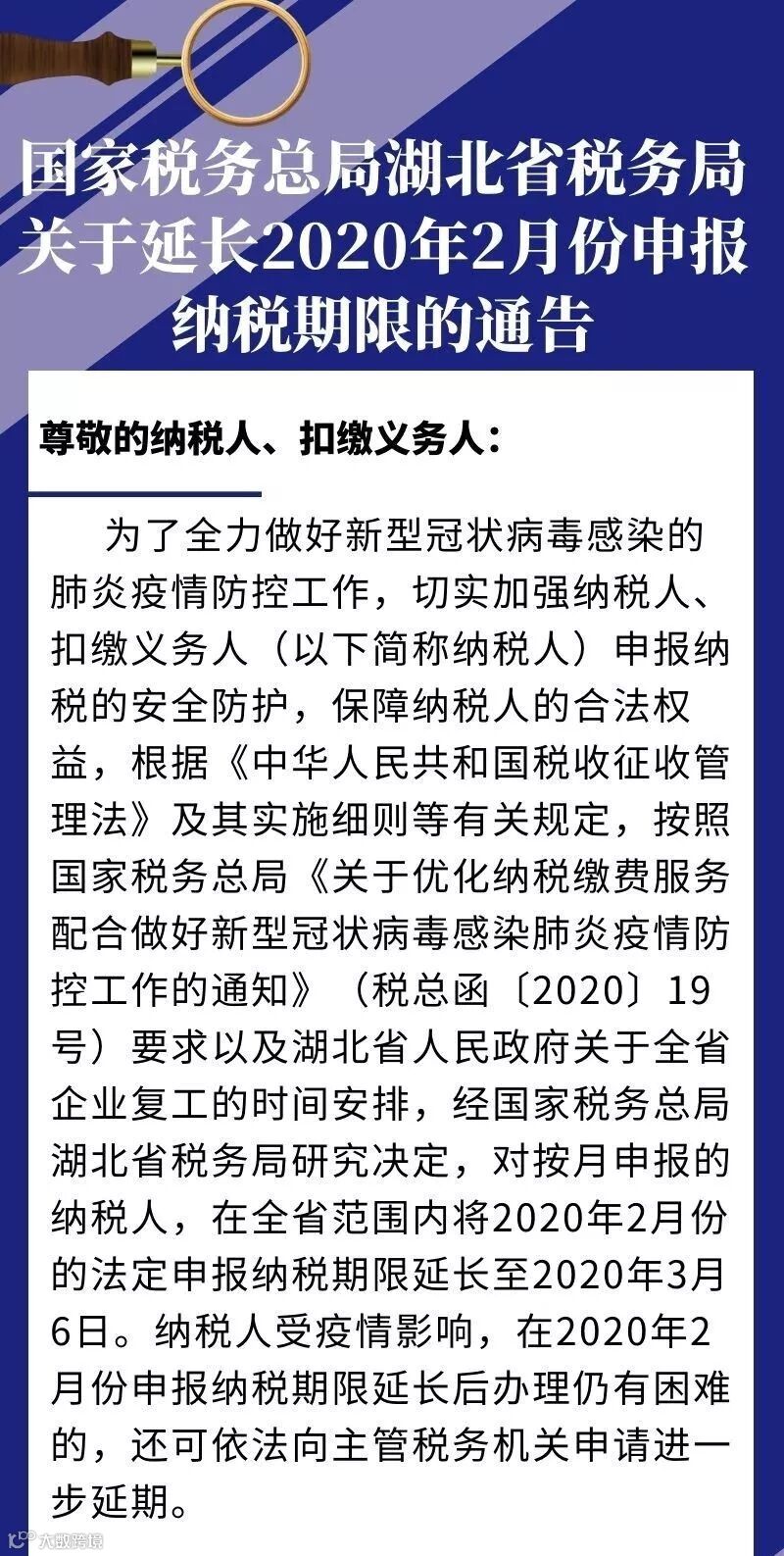 湖北省由于疫情严重,又单独出台政策将2月征收期延长到3月6日。
