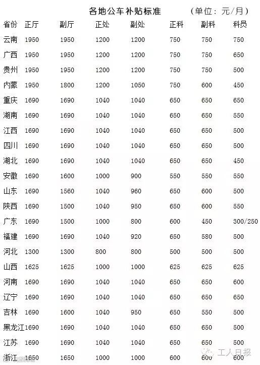 从目前公布的22地公车补贴来看,云南、广西、贵州均是补贴“顶格”,是司局级1300元标准的150%。值得一提的是云南省,厅级、处级、科级的补贴均为中央要求范围的最高值。