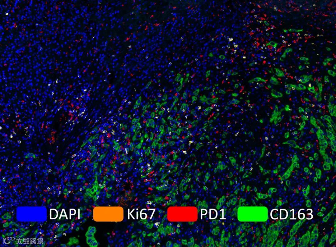 基于全新一代TSA染色技术同时标记10种生物标志物后,使用TissueFAXS Spectra系统进行连续全光谱高 倍率成像,构建全景(多光谱)虚拟 切片。