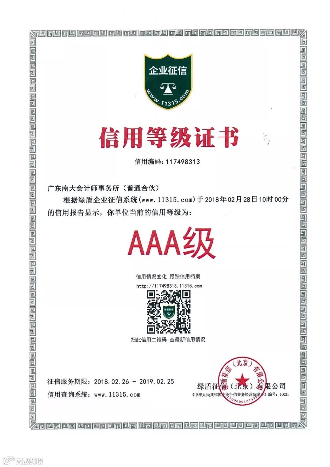 根据绿盾企业征信系统于2018年2月28日的信用报告显示,广东南大会计师事务所(普通合伙)的信用的等级为AAA级。