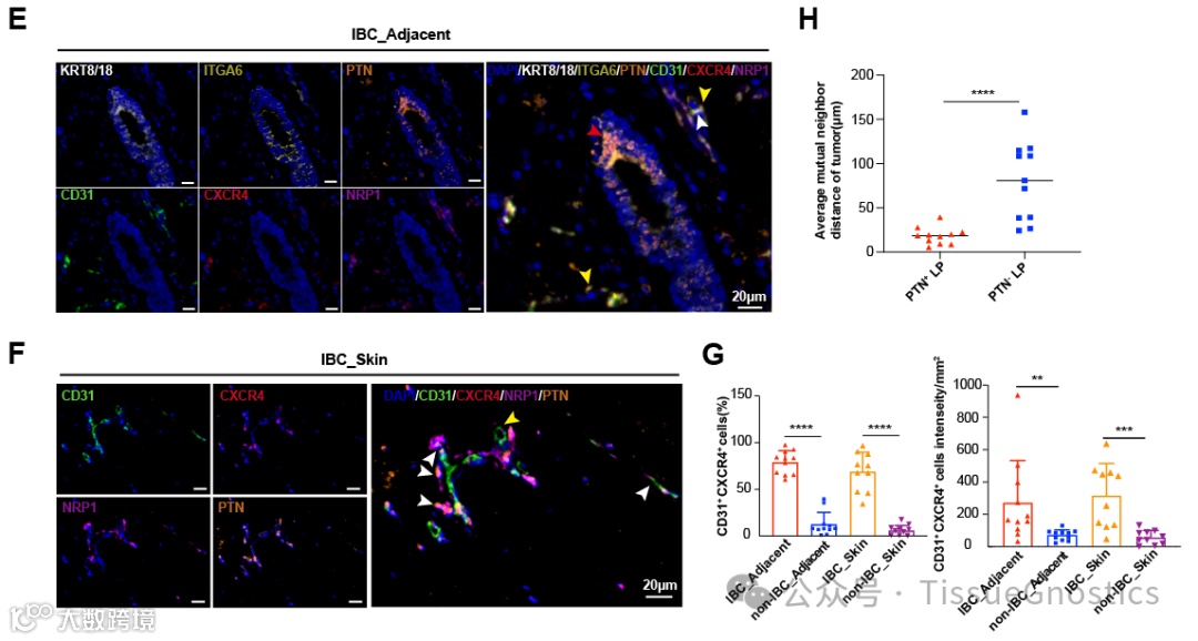 (E)代表性的mIF染色图像显示邻近的正常IBC组织。白色箭头表示PTN+ LP细胞(krt1 /18+ ITGA6+ PTN+,用红色箭头标记)分泌的PTN与尖端细胞(CD31+ CXCR4+ NRP1+,用黄色箭头标记)的NRP1相互作用。标尺,20 μm。