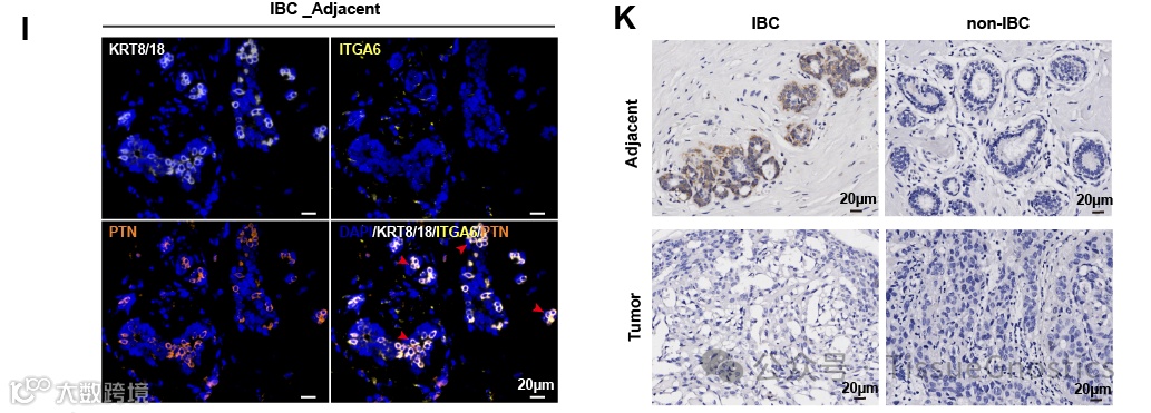 (K)邻近正常组织、IBC肿瘤(左图)和非IBC组织(右图)PTN免疫组化(IHC)染色的代表性图像。标尺,20 μm。