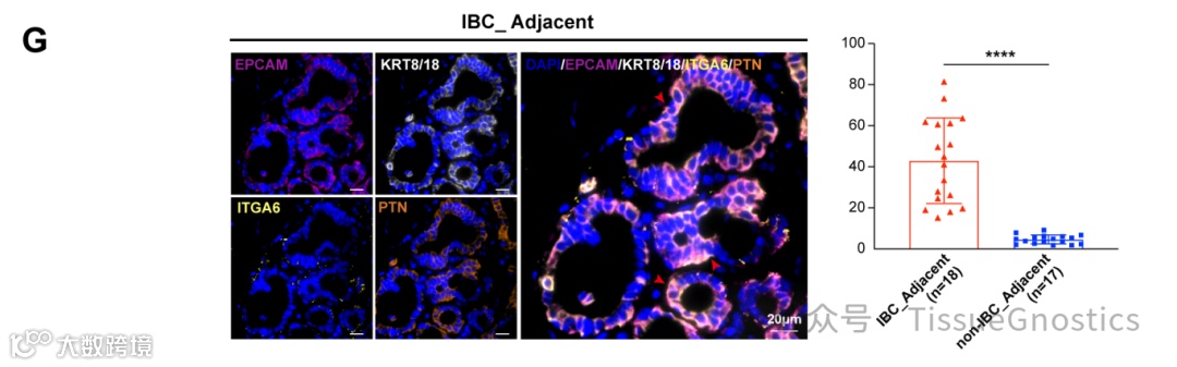 (G)多重免疫荧光染色(mIF)的代表性图像(左图) 中的 PTN+ LP 细胞(EPCAM+ KRT8/18+ ITGA6+ PTN+,红色箭头标记)。IBC 邻近正常组织(IBC_Adjacent)中的 PTN+ LP 细胞(EPCAM+ KRT8/18+ ITGA6+ PTN+,红色箭头标记)。尺度条,20μm。上皮细胞中 上皮细胞(EPCAM+)中 PTN+ LP 细胞的百分比(右图)。正常组织(右图)。点数表示患者人数。Wilcoxon 秩和检验。****p < 0.0001
