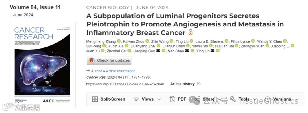 中山大学附属第一医院林颖教授团队近期在Cancer Research发表题为“A subpopulation of luminal progenitors secretes pleiotrophin to promote angiogenesis and metastasis in inflammatory breast cancer”的文章。