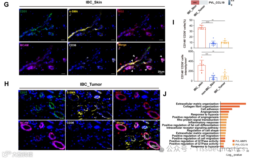 (H)具有代表性的 mIF 染色图像,用于验证 IBC 受损皮肤中 EC(CD31+)和未成熟 PVL 细胞(MCAM+CD36+,白色箭头标记)之间的位置。比例尺,20μm。(I) 用于验证非 IBC 皮肤中 EC(CD31+)和 PVL 细胞(α-SMA+ NG2+ CD146+,红色箭头标记)之间位置的代表性 mIF 染色图像。