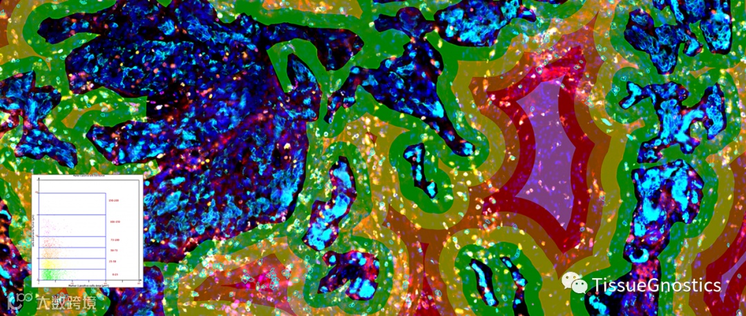 TissueFAXS Cytometry组织流式定量分析技术根据识别到的肿瘤轮廓,结合实验需要,实现以微米为尺度寻找肿瘤内外不同距离范围内目的细胞的功能。可定义的识别的标准包括核/质/膜的各种形态及染色,也可以包括双标/三标乃至无上限标记数量的共表达目的细胞。通过准确定量微环境中发挥不同功能的特定细胞及其位置,找到不同实验组中的差异趋势。
