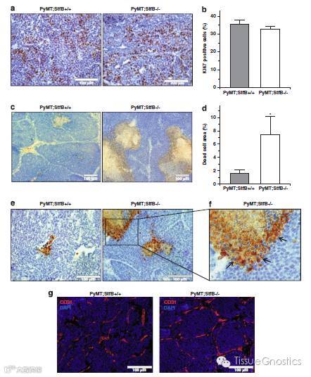 (a)对14周的PyMT;Stfb+/+小鼠和PyMT;Stfb-/-的小鼠利用Ki67的原发性肿瘤检测。40倍目镜下的相对属型影像。