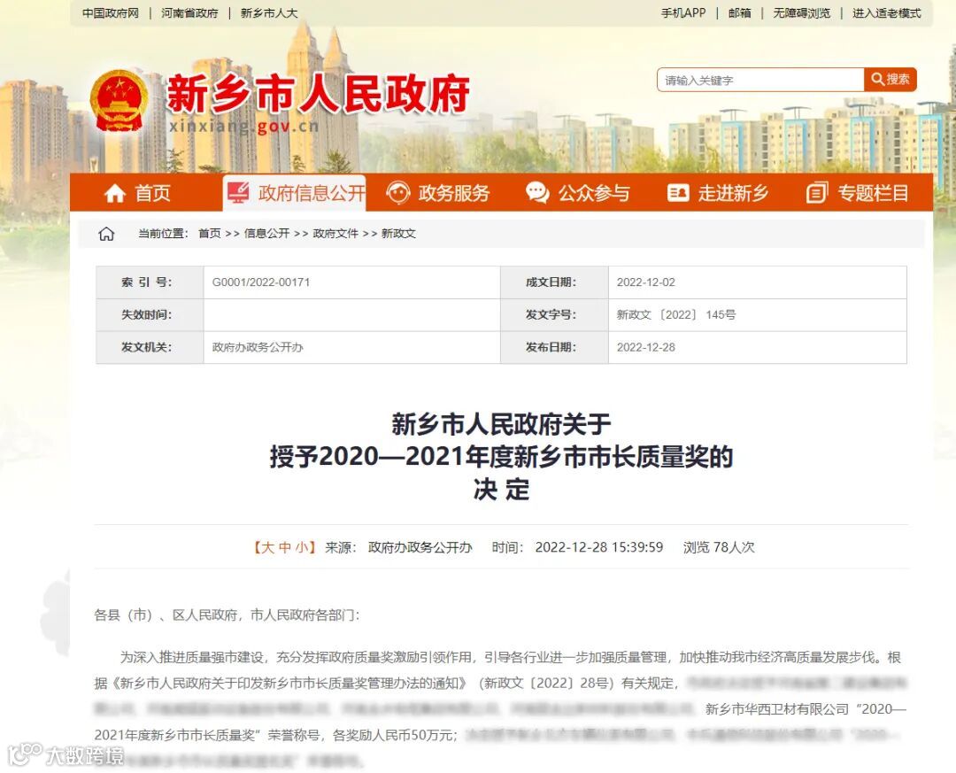 根据新乡市人民政府信息公开,关于授予2020—2021年度新乡市市长质量奖,充分体现了华西卫材高度重视质量工作,注重先进典型、标杆的培养和示范带动作用。