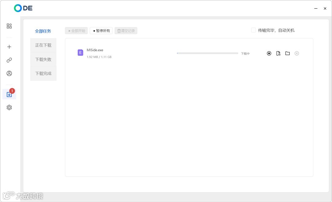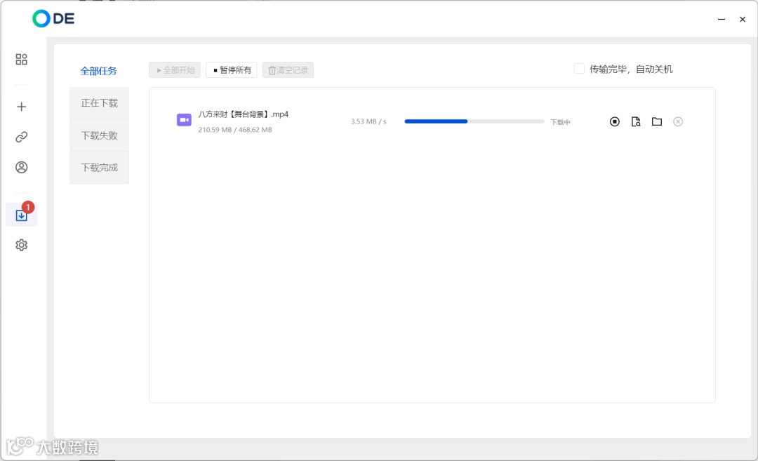于是,这个下载任务,便会在传输列表中实时反馈出来(下载速度,跟使用时间有关,一般来讲,白天下载会快):