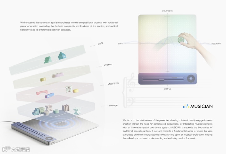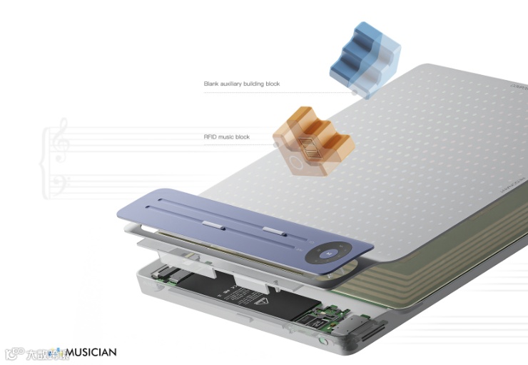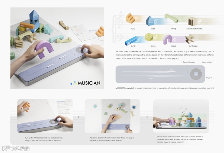 MUSICIAN的灵感源于“音乐是流动的建筑",它鼓励孩子们像搭积木一样轻松地创造自己的音乐。设计师将抽象的音乐创作分层原理转化为更直观的积木搭建行为,创造一座声音的乐园,为音乐初学者铺设一条更加简单的音乐学习和创作道路。