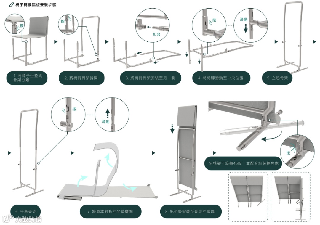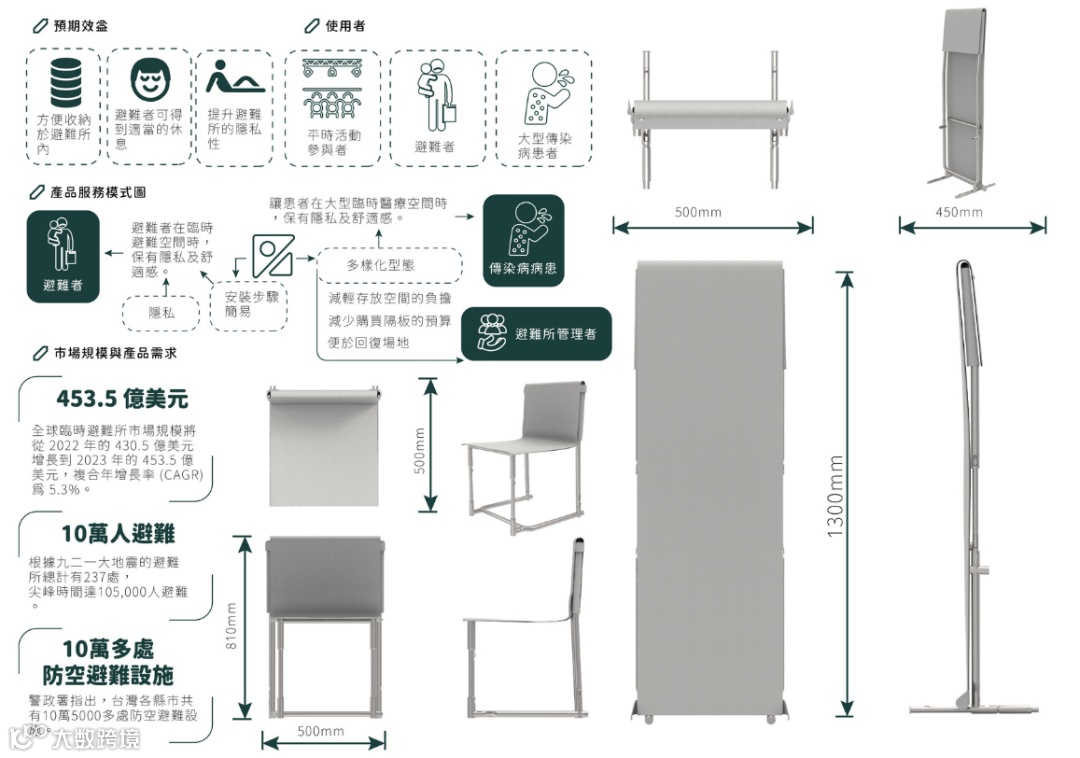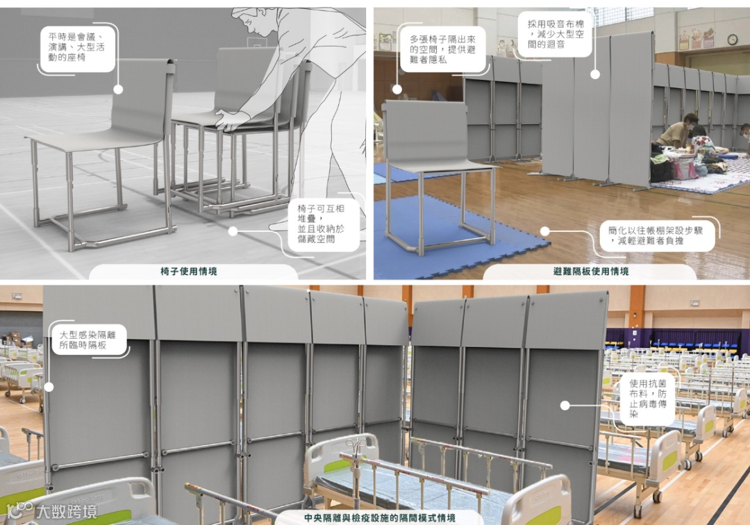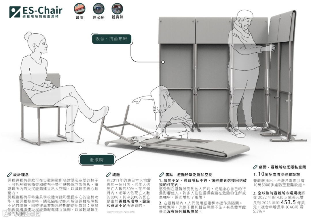灾难避难椅平时兼具学校体育馆和里民中心的座椅功能。当灾难发生时,隐私隔板功能可解决避难所隔板不足的问题,同时提高非紧急时期的使用效益;简易的拆装构造使灾民能够轻松建立隔间,以减轻避难生活的负担。