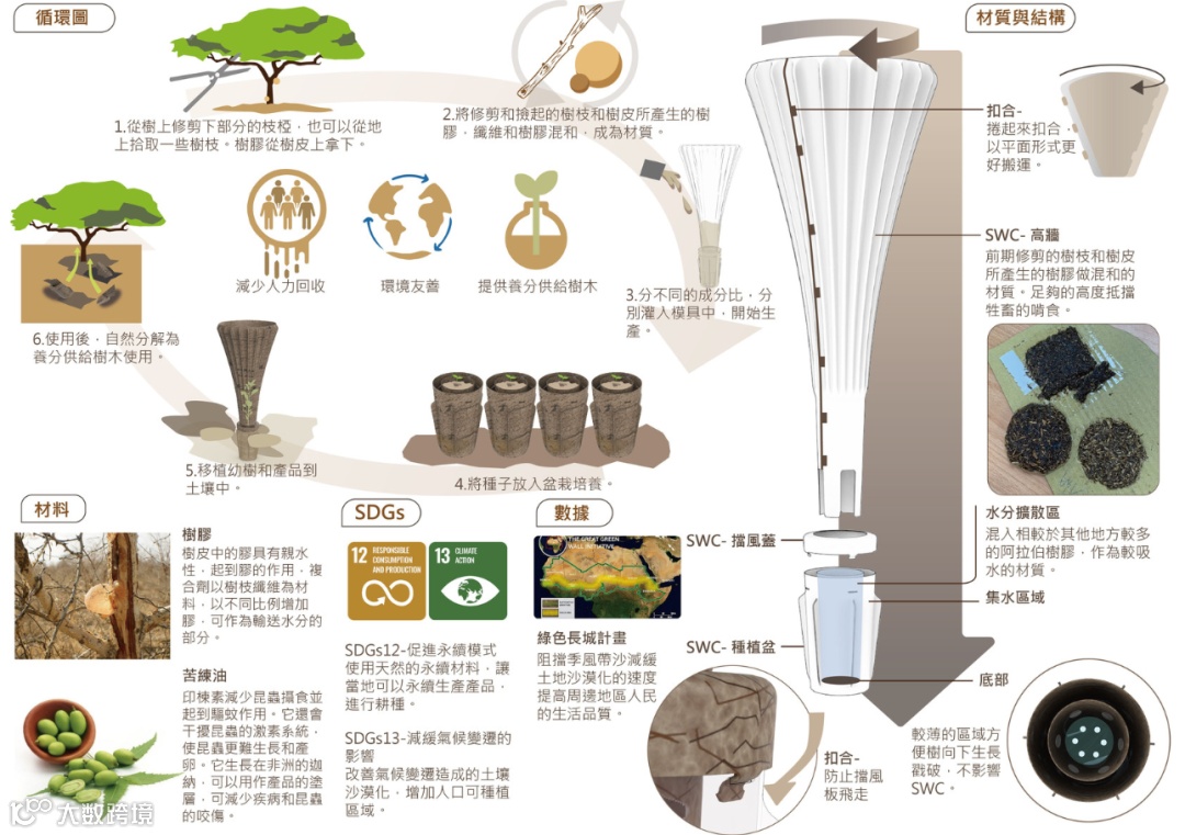 产品外面会涂上当地的苦炼油,减少病虫害接近,增加幼苗在第一年的成长。防护林集水器可以减少杂草生长和牲畜啃咬,增加幼树的存活率。