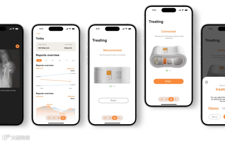 Dstone是一款辅助药物治疗痛风的治疗方案,结合app与碎石产品旨在为患者提供更好的治疗体验。产品将通过冲击波发射装置缓慢震碎痛风石从而加速痛风石的溶解。而通过配套的app可以对产品的治疗强度进行控制。