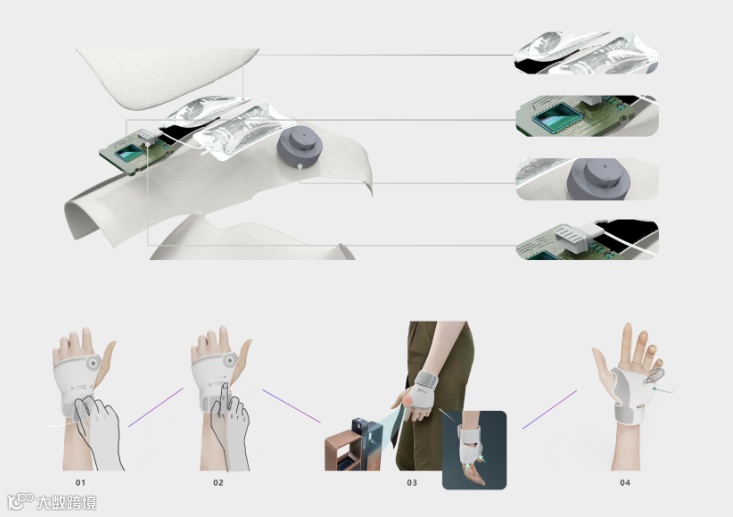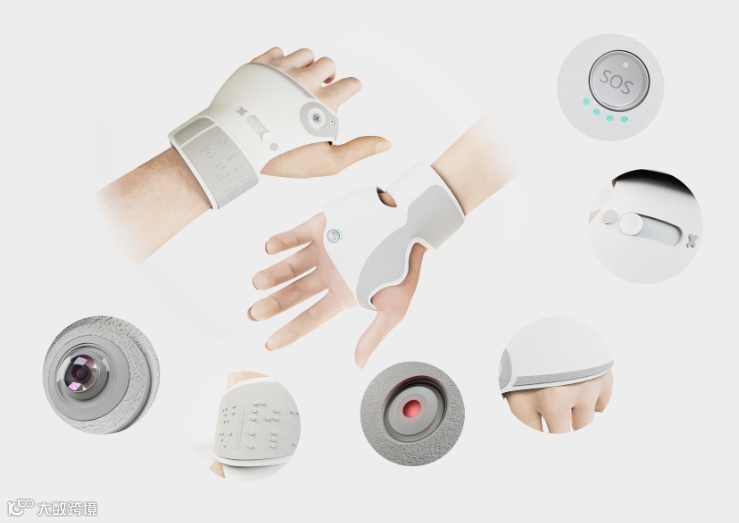 Touch & Guide 智能导盲手套是一款用于引导盲人出行的产品。该手套通过激光雷达探测识别前方障碍物,在手套背面和掌心处设有4个气囊提供不同方向的力反馈,引导盲人避开障碍物。这种力的引导试图模拟人手的抓握和牵引感,让盲人有一种被亲人陪伴的感觉。