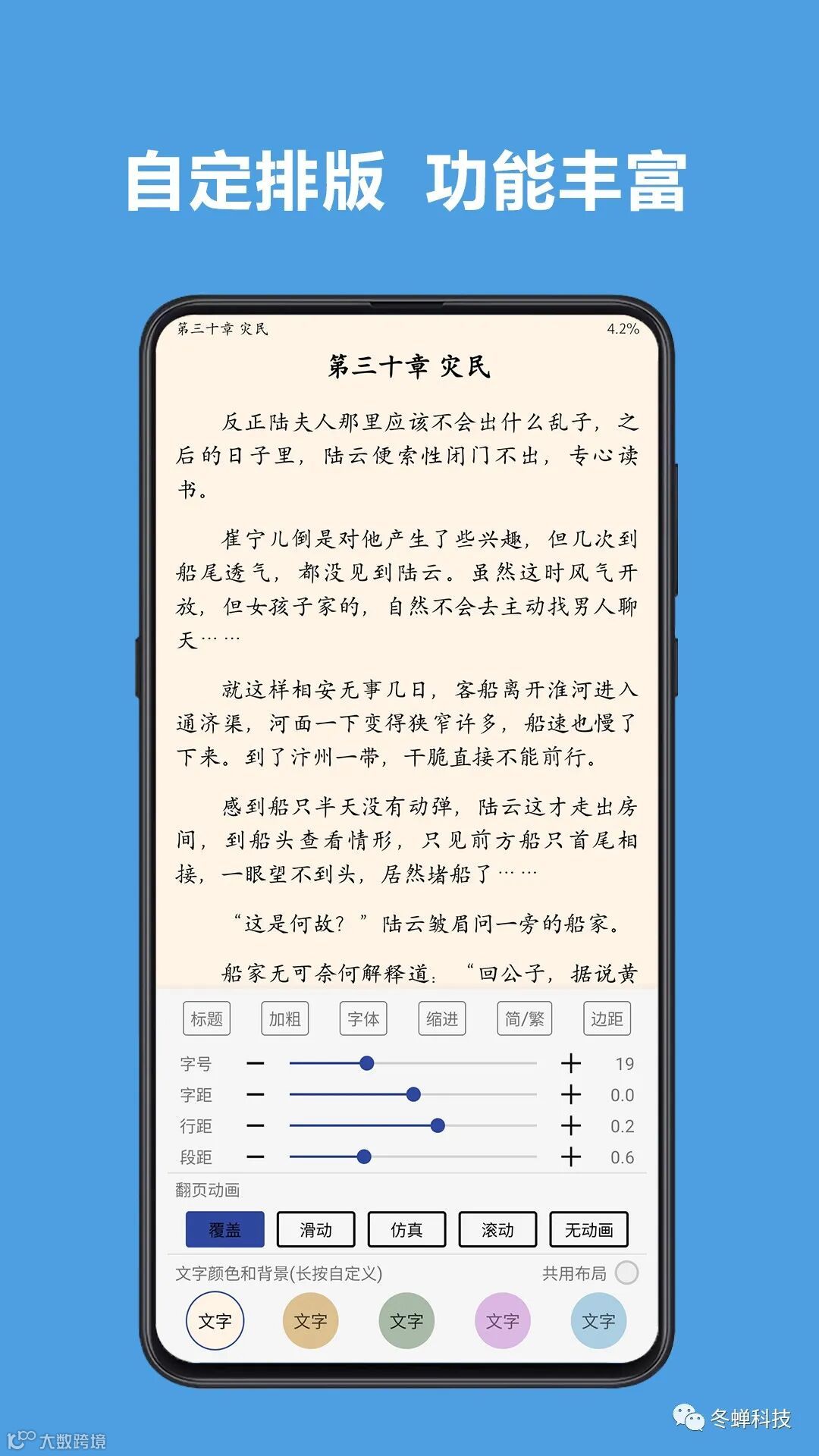 支持高度自定义阅读界面,切换字体、颜色、背景、行距、段距、加粗、简繁转换等。