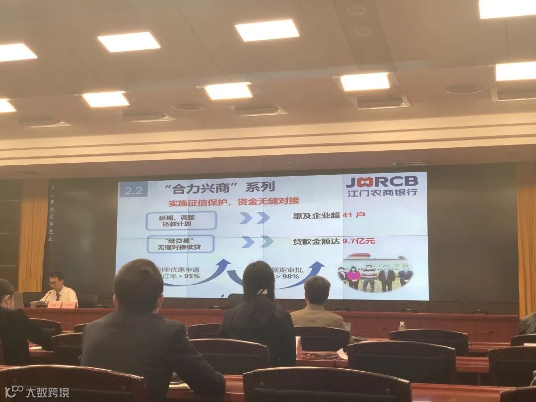 会上,首先由市长蔡德威致辞;然后由江海区政府有关领导就推动企业复工复产工作进行经验分享;接着由人民银行江门市中心支行、江门农商行等金融机构代表就相关货币政策、专项贷款、普惠政策和特色产品进行推介;最后由广东省地方金融监督管理局代表对“广东省中小企业融资平台”的融资产品、操作指引等方面作了专题介绍。