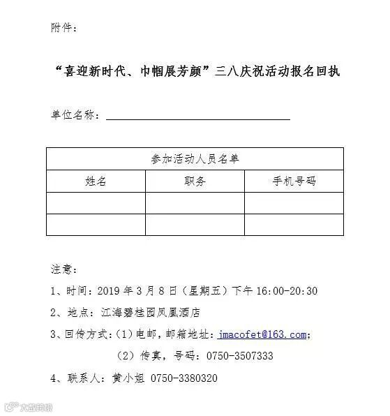 附件:“喜迎新时代、巾帼展芳颜”三八庆祝活动报名回执
