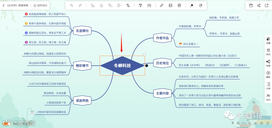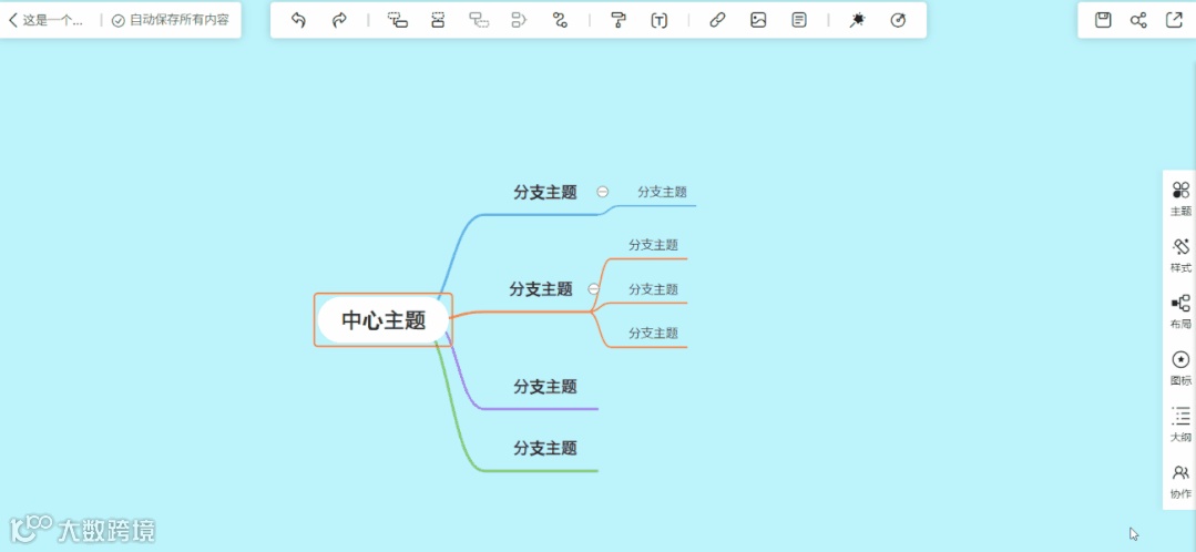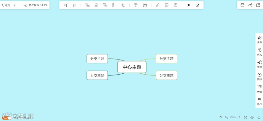 打开思维导图,在右侧找到『 主题 』,单击打开弹窗后,点击”一键搭配”,可以快速搭配主题样式,点击“更多主题”,可以在软件自带的更多主题中选择。