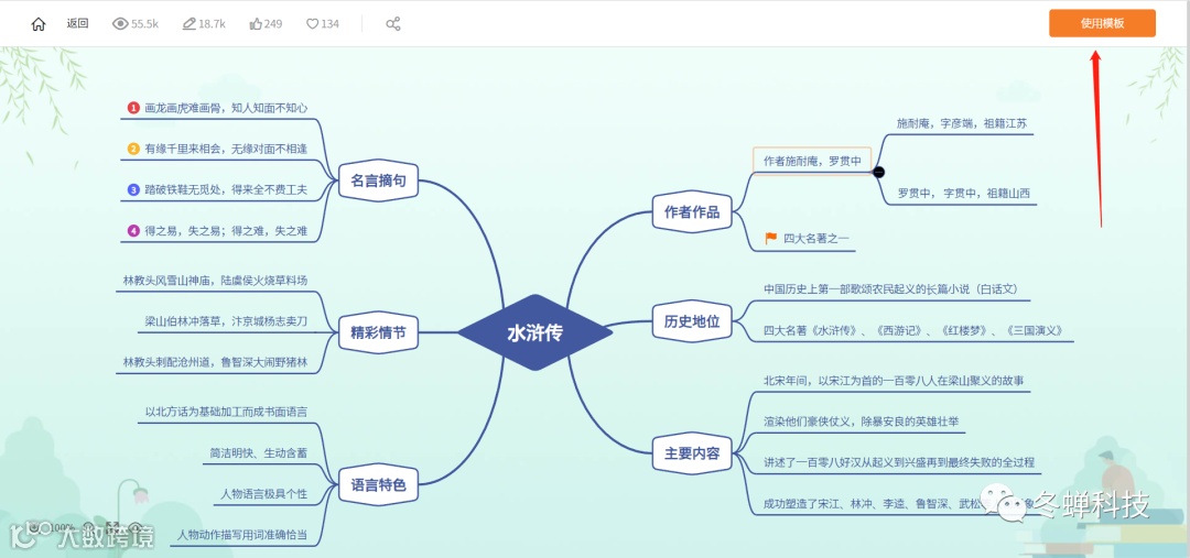 进入热门模板,挑选喜欢的思维导图模板,鼠标单击打开后,右上角点击『 使用模板 』,就可以在此模板上制作思维导图。