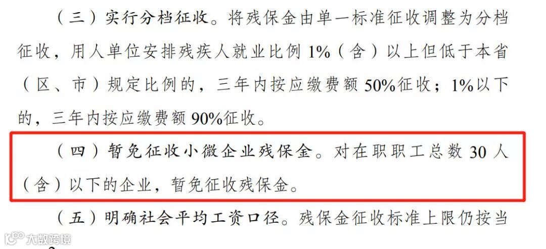 发改委等六部门印发《关于完善残疾人就业保证金制度更好促进残疾人就业的总体方案》(发改价格规〔2019〕2015号),明确自2020年1月1日起:对在职职工人数30人(含)以下的企业,暂免征收残保金。