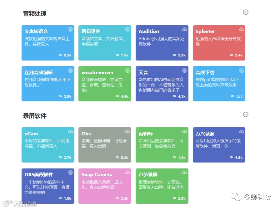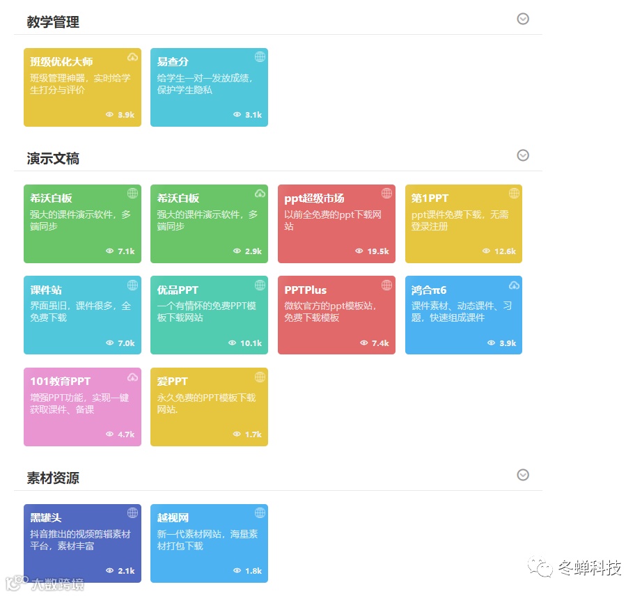 如有需要速领,资源失效请添加微信“dongchanguanfang”。这是一款非常好用的免费、优质、高效、安全的教师必备工具导航网站,网站界面简洁,功能强大,实用又方便,里面不光有免费公开课、教学资源、学术科研、教学管理、演示文稿、素材资源、音频处理、录屏软件、图像处理、视频处理、动画制作、电子图书、思维与创作、实用办公工具等功能