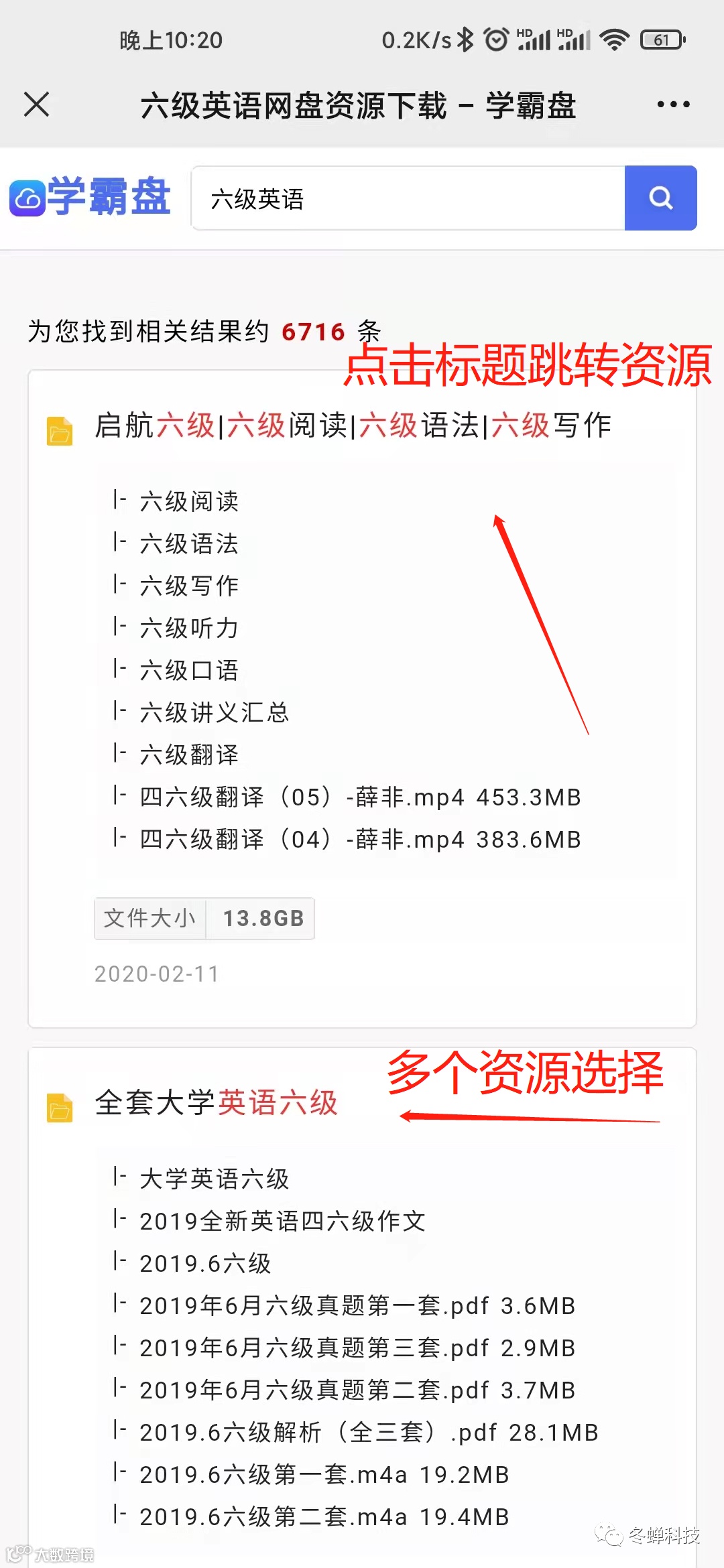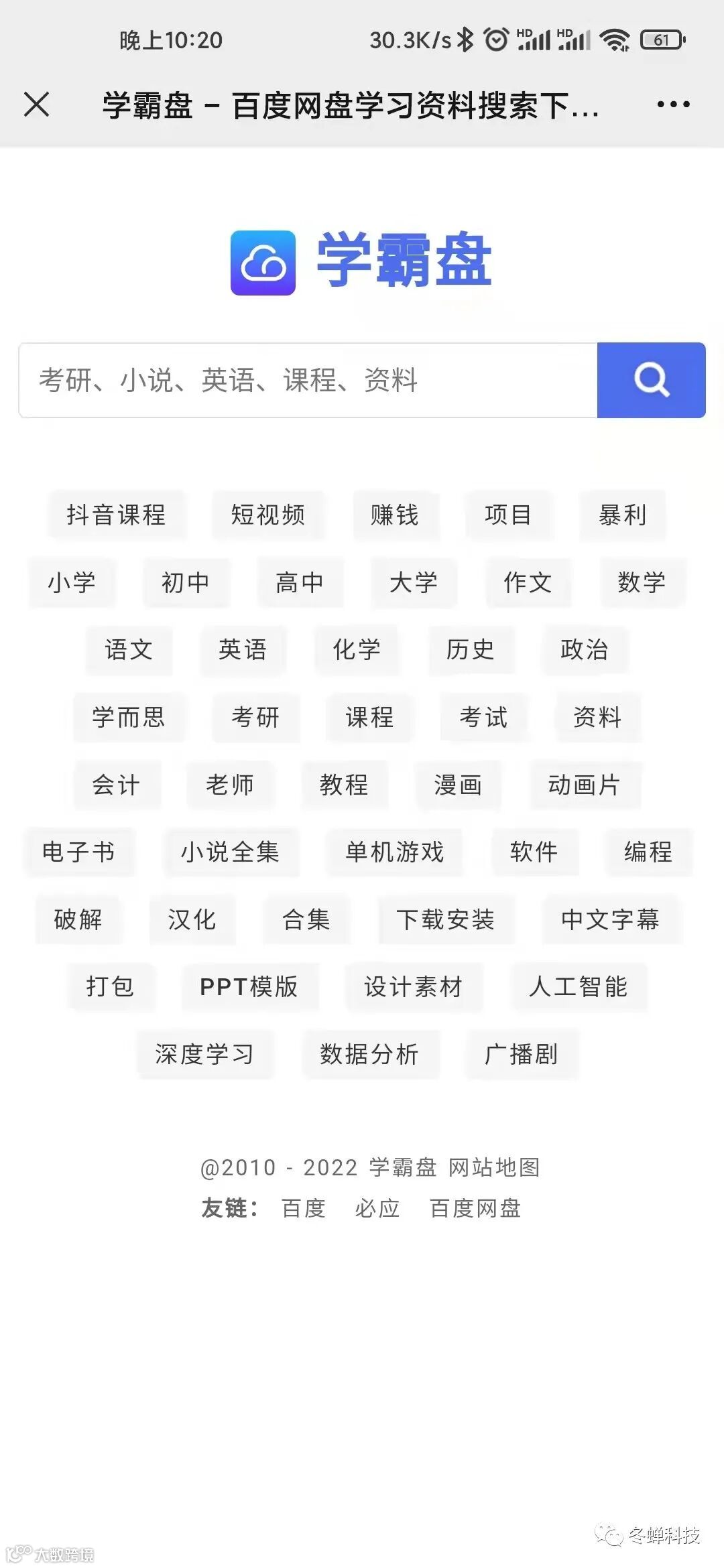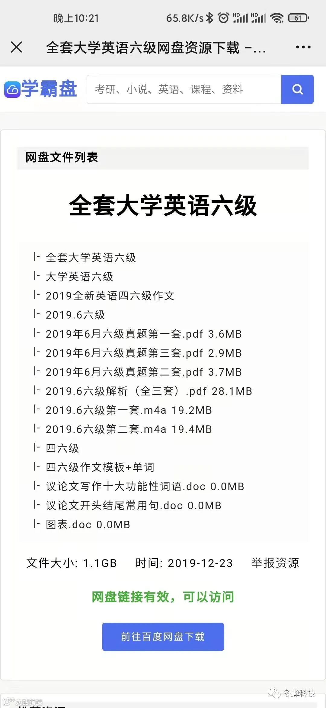 最近有朋友问小编有没有网盘检索的网站,比如想找六级英语资料。其实之前小编曾经分享过一个 “免费极品网盘资源搜索工具!”但是需要安装工具只能电脑端使用,有些朋友不太方便使用电脑,所以小编为大家找到了一款网盘资源搜索网页,打开页面直接搜索即可!