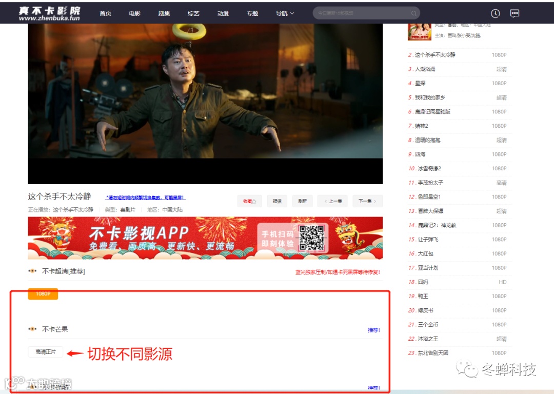 首页可以搜索影视,电影、剧集、综艺、动漫、专题、观影很流畅,超清1082P,同时提供多个片源可切换,唯一的缺点右下角有广告,但是可以关闭不影响观看电影~