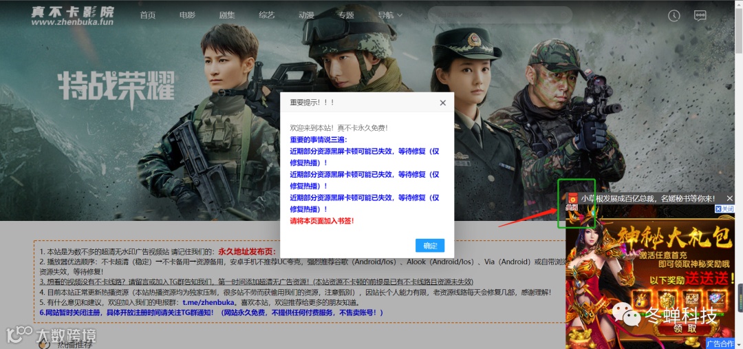 首页(右下角有广告 点击绿框内关闭可关闭)