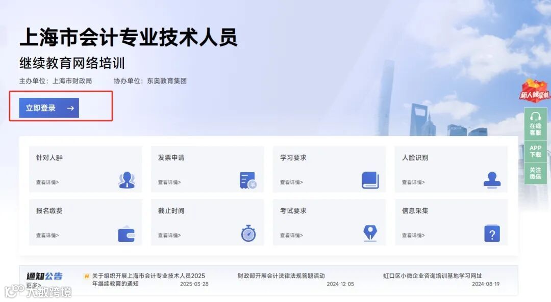 已经完成信息采集的会计人员可直接登录上海市会计继续教育网站进行报名学习,网址为https://shanghai.dongao.cn/。点击“立即登录”跳转至“上海一网通办”平台,点击“上海市会计人员网络继续教育报名系统”进行登录。