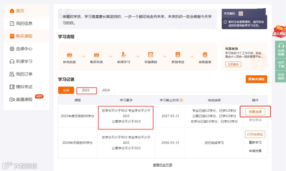 登录成功后,页面跳转至选择网校和学习年度页面。选择需要学习的培训年度及对应的培训等级,勾选“东奥会计在线”,点击【确认报名】,即可跳转至学员中心进行缴费、选课、学习。