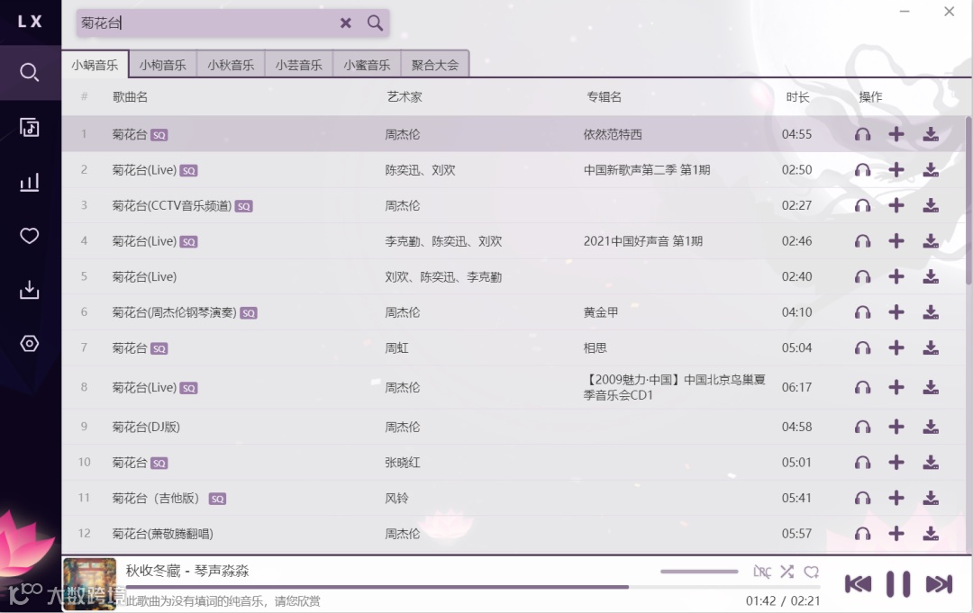 软件自带多个音乐源 默认'小蜗音乐'点击可换源