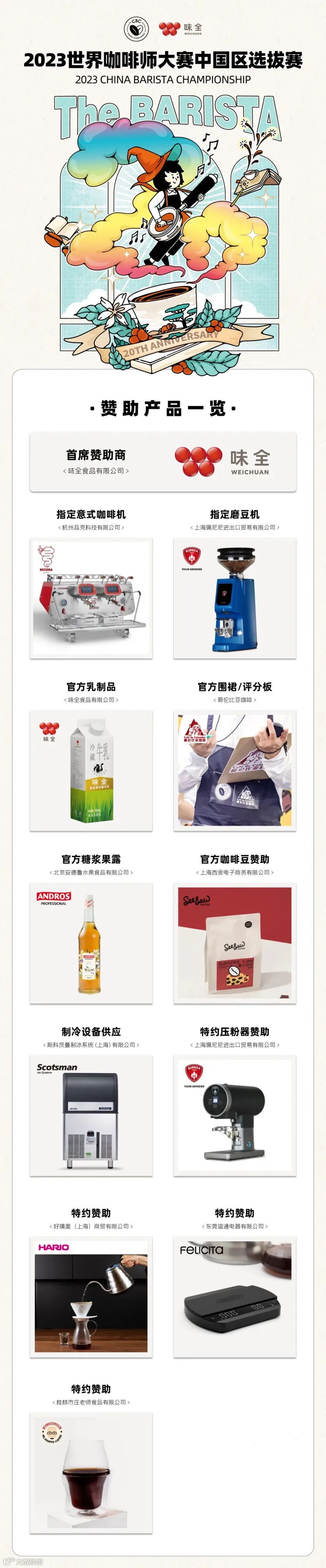 与此同时,新一届的2023世界咖啡师大赛中国区选拔赛也同步启航,经过多轮次的双向匹配,上海珮尼尼进出口贸易有限公司成为了本次赛事<指定磨豆机>赞助商(赞助机型EUREKA新款Atom EX65)及<特约压粉器>赞助商。