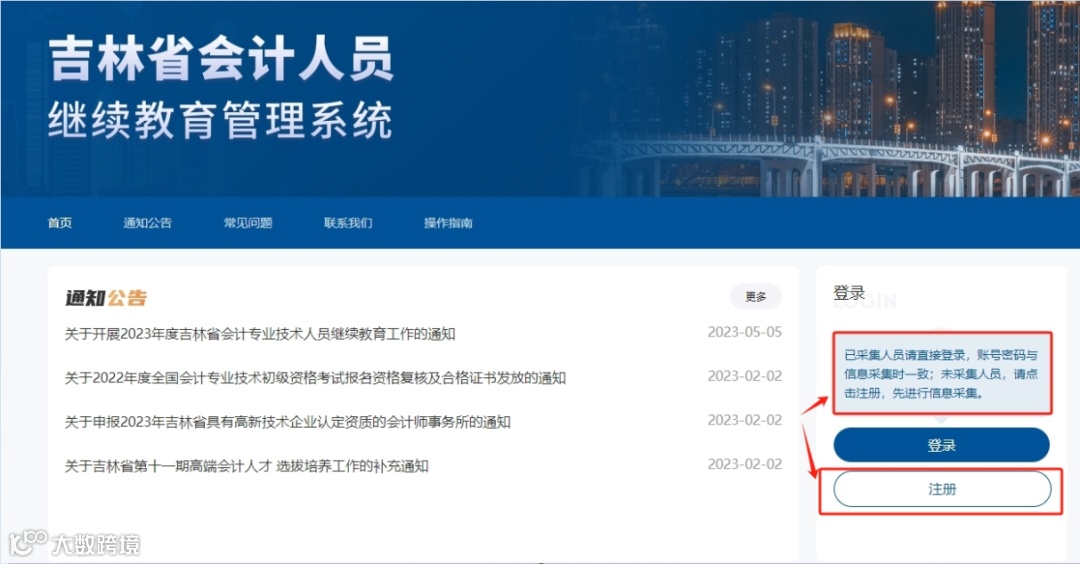 【1】网站直接跳转至吉林省会计人员继续教育管理系统,已完成信息采集的人员可直接选择“登录”。