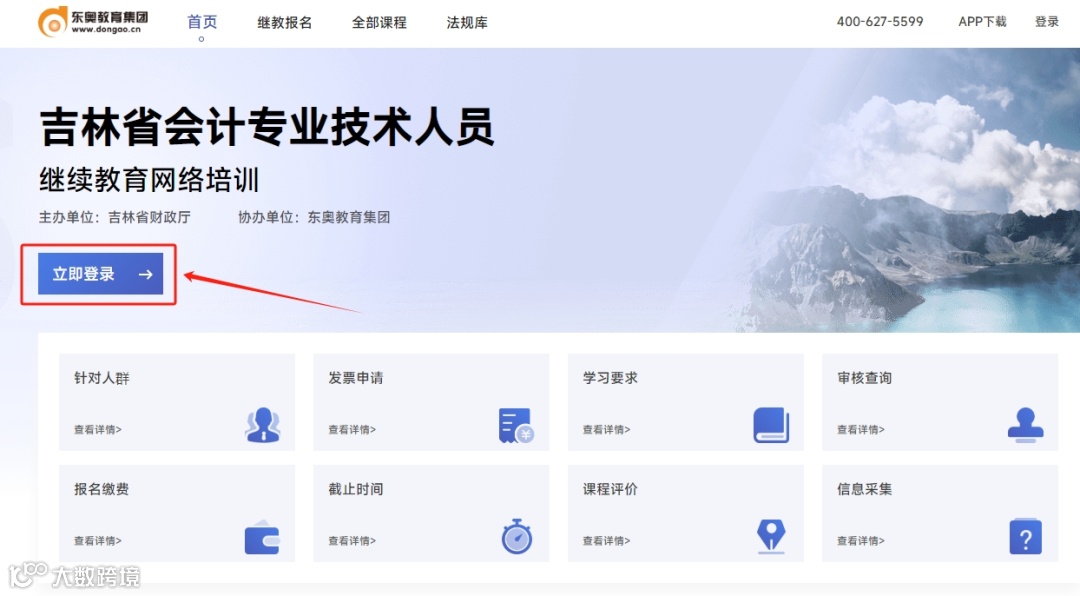 会计人员可进入吉林省会计继续教育网站参加线上报名学习,网址为https://jilin.dongao.cn/。进入网站后点击“立即登录”。