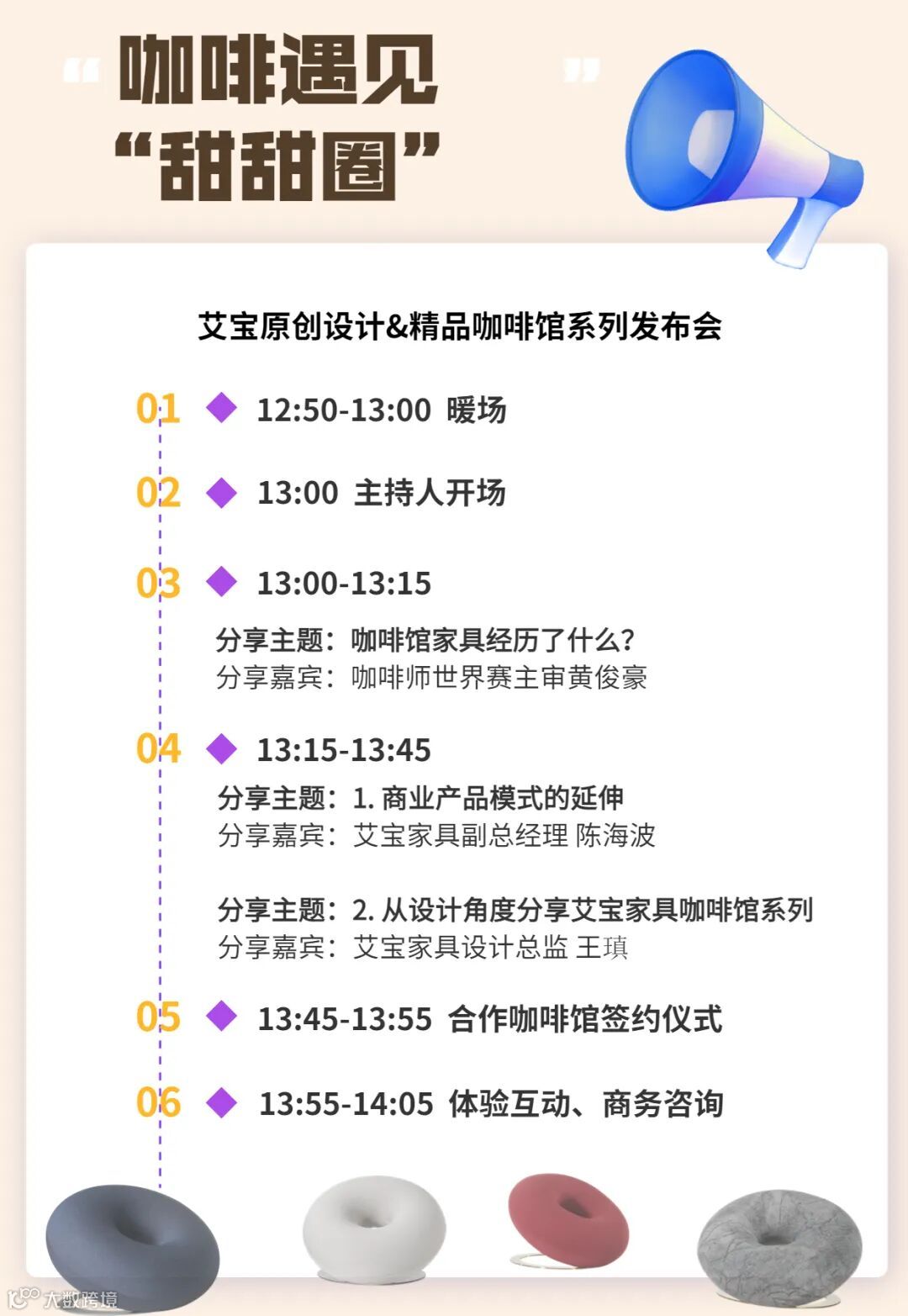 本次「咖啡遇见“甜甜圈”艾宝原创设计&精品咖啡馆系列发布会」邀请了对原创设计不懈地追求的艾宝家具。现场将汇集众多咖啡从业者、咖啡店主、评委等咖啡行业的主流人群在艾宝“甜甜圈”与咖啡的专题展示区域参观交流。艾宝咖啡家具发布会将会在现场发布合作优惠政策。