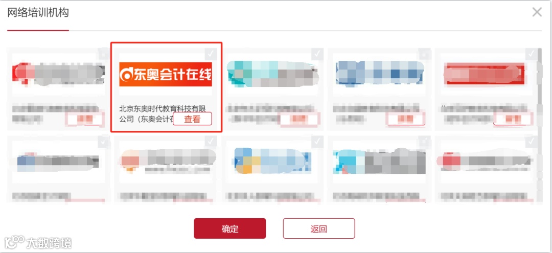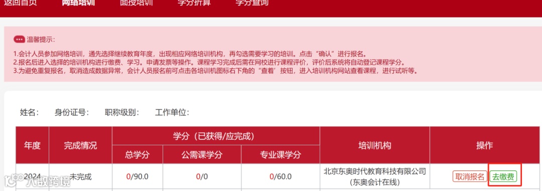 【2】进入系统后在要学习的年度后选择“东奥会计在线”,进行报名。报名成功后点击去缴费即可进行学习。⬇