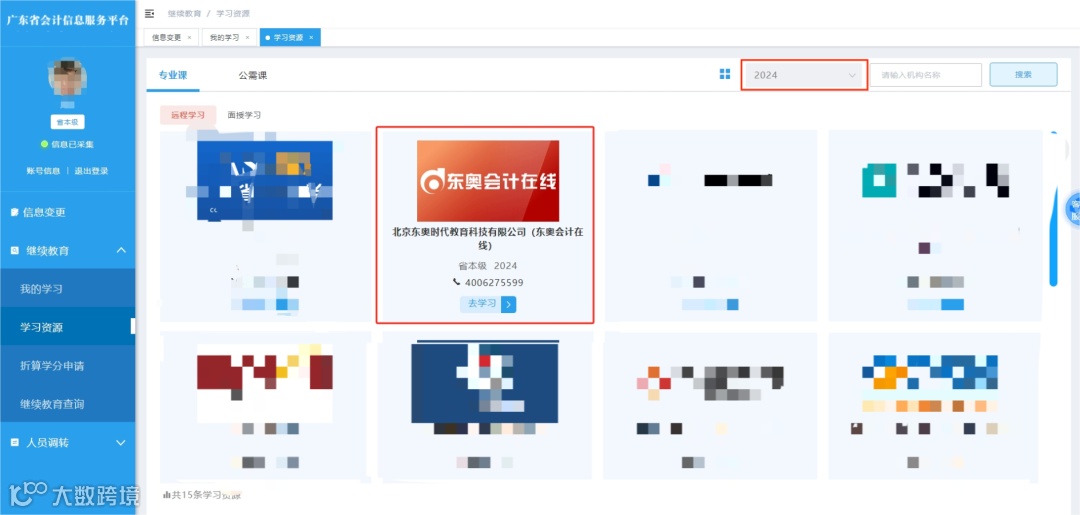 1.会计人员登录成功后,点击【继续教育】栏目中“学习资源”。进入学习资源页面后,选择需要学习的培训年度,选择“东奥会计在线”,点击【去学习】,即可跳转至学员中心进行缴费、选课、学习。
