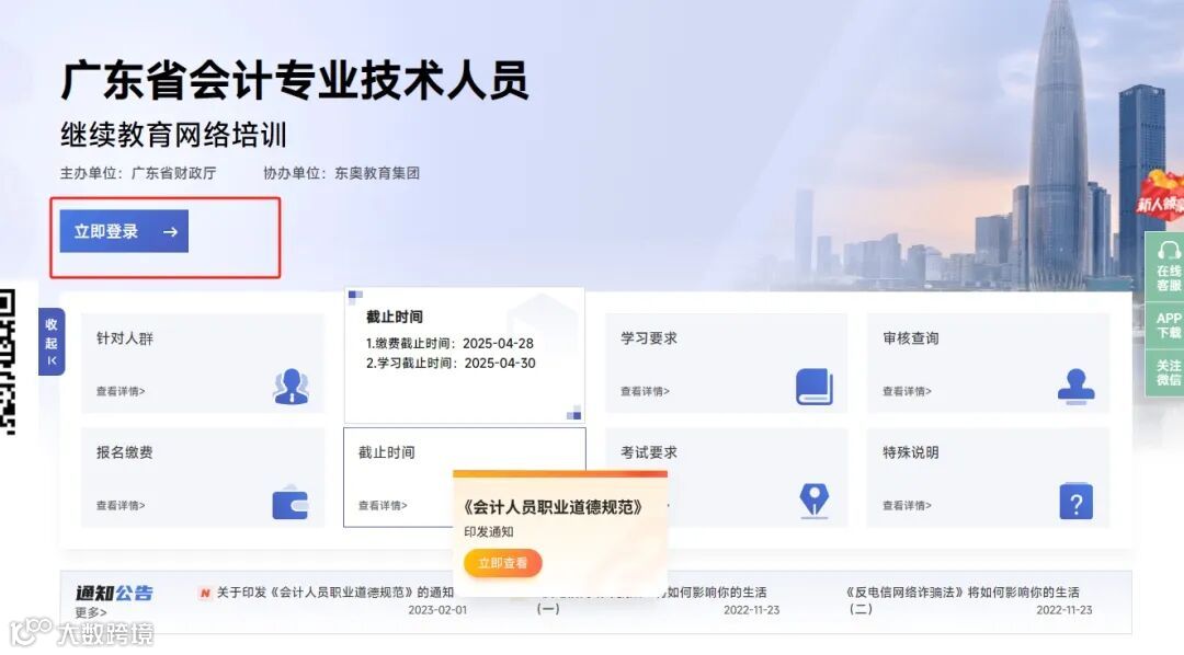 1.完成信息采集的会计人员可直接登录广东省会计继续教育网站(https://guangdong.dongao.cn/),点击“立即登录”,如图: