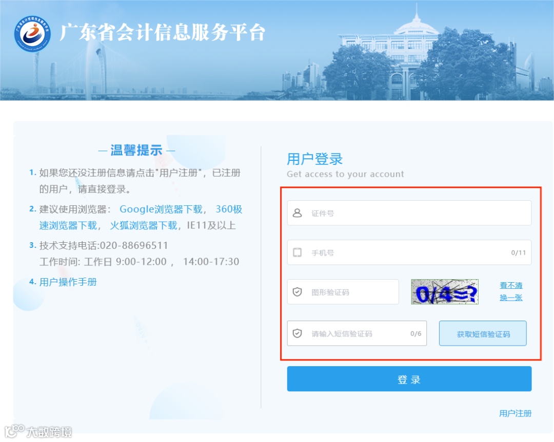 2.页面将跳转至广东省会计信息服务平台,尚未注册的会计人员请点击“用户注册”;已完成注册的会计人员,可直接登录。登录成功后,需要将手机号、地区、身份证号、姓名等信息补充完整。