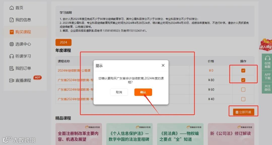 2.进入【学员中心】,点击左侧导航栏“购买课程”,勾选所需的学分课程。点击“确认”,即可进行支付,完成购买。