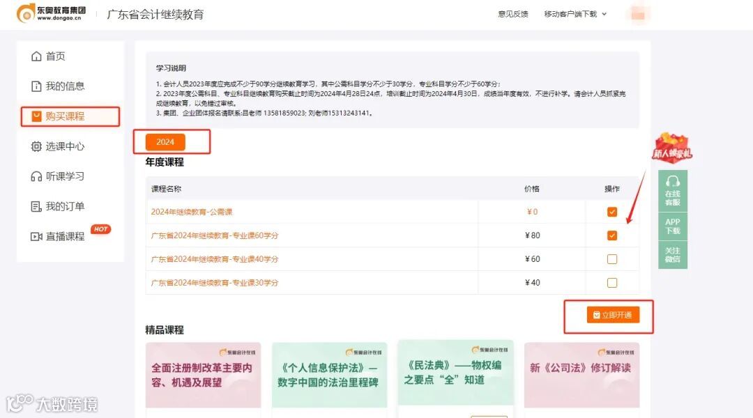 2024年广东省会计继续教育学分要求:专业学习不少于60学分,公需课程不少于30学分(公需课有2个专题,任选其中一个专题学习)。学满学分之后,按照提示完成后面的操作。