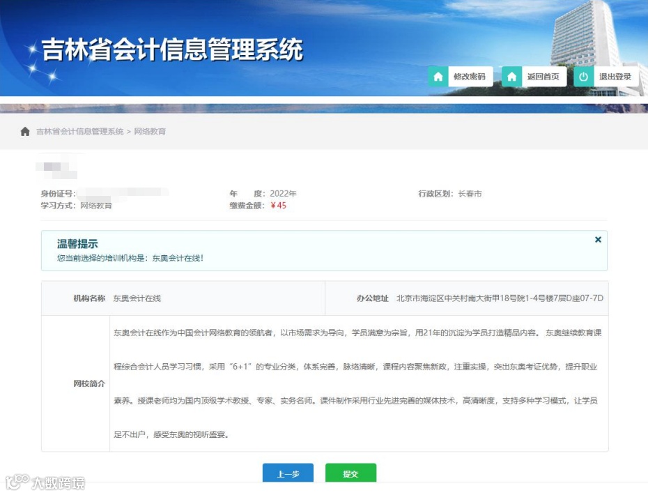 登录成功后,学员选择“继续教育报名”—点击“查询”、“报名”—选择“东奥会计在线”,点击“下一步”。