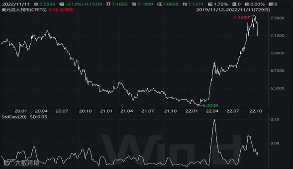从人民币汇率走势来看,2022年4月份以来的人民币汇率波动率(StdDev(20) 20日波动率指标)明显大幅增加,波动率维持在3%以上交易日占到了总交易日的比例高达63%,2021年该指标占比仅为31%。这表明人民币汇率波动已经为常态化,并且人民币汇率波动幅度将会大大提升。