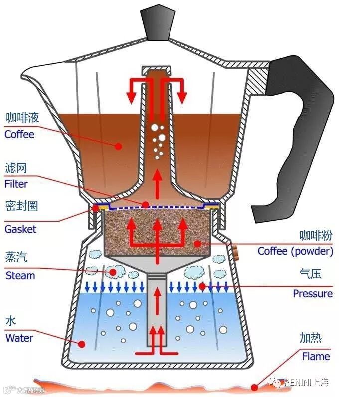 壶身分上下两层,放在下半部分的水煮开沸腾后,压力会使沸腾的水通过装有咖啡粉的网状过滤器,进而在壶的上半部分得到萃取后的咖啡液。