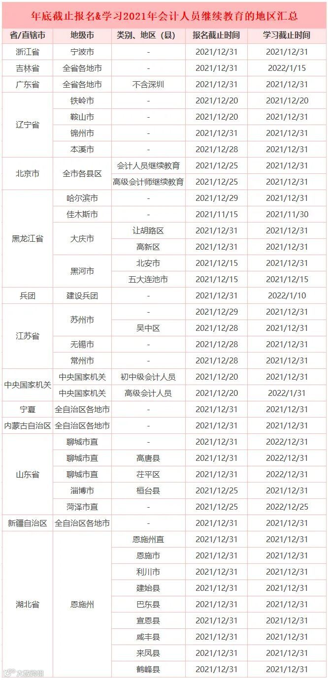 上述内容即是将于2021年底截止本年度继续教育学习和报名的地区汇总,由于各地的继教时间可能会发生变化,本文的时间信息截止到发文之日有效。学员如需了解更多会计继续教育时间安排,请登录东奥会计继续教育官网或咨询当地会计管理部门!
