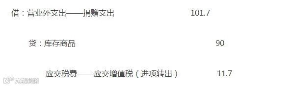 乙企业通过正规公益组织,向吉林地区捐赠了口罩和消毒液总计120万元,账面成本90万元,进项税额为11.7万元,则账务处理如下:(单位:万元)