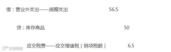 丙企业向其他单位捐赠自己生产价值50万元的物资,销项税额6.5万元,则账务处理如下:(单位:万元)