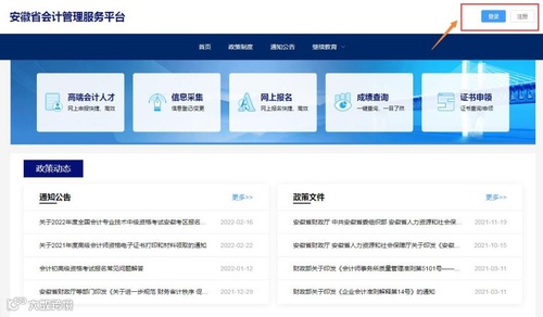 学员报名学习要在安徽省会计人员管理平台上进行,点击页面右上角“登录注册”按钮,进入登录页面。已有账号的学员输入手机号或身份证号码和密码登录,未注册账号的学员需注册登录,成功后根据提示信息进行学习。如下图所示: