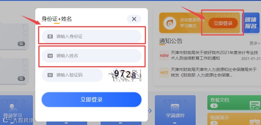天津市继续教育采用“身份证+姓名”的登录方式。进入到东奥网站天津市继续教育页面后,在页面右侧登录窗口输入身份证号、姓名和验证码,点击登录即可。
